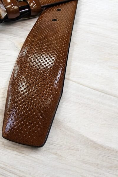 الحزام جلد صناعي عسلي مبزر مبزر صناعة تركية بالكامل ، و مصمم بعناية بنفشة متناسقة, من خامات عالية الجودة، بنمط عصري يتماشى مع العديد من الإطلالات المتنوعة, مناسب لجميع الاعمار والاذواق .